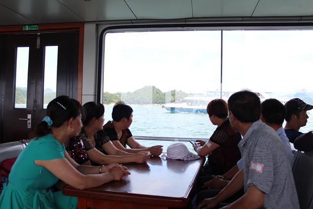 登上沁园07号游船,我们此次千岛湖之旅算是正式开始了。泛舟于“天下第一秀水”,放眼望去,碧波无边,群岛竞秀,真是“千岛碧水画中游”。大家正静静地陶醉在窗外的无边美景当中,忽然间旁边游船上有人钓起来一尾一尺多长的大鱼,让我们兴奋起来,也算见识了这里鱼儿的肥美。